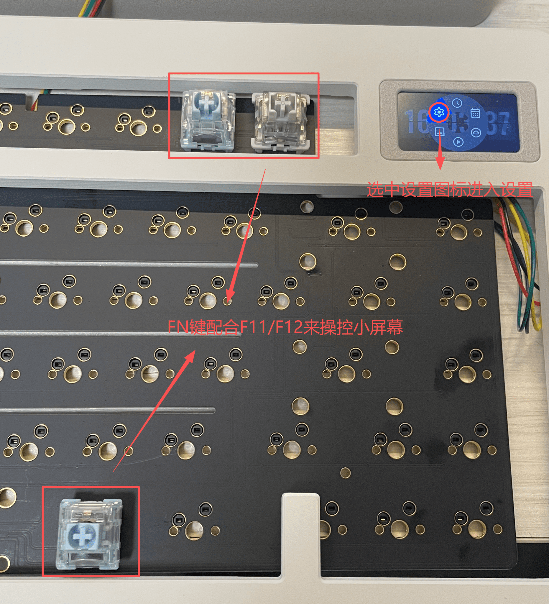 - 请先将小屏幕的5P排线与键盘PCB上的5P座子进行链接,同时要保证键盘PCB与键盘主体的4P排线链接。