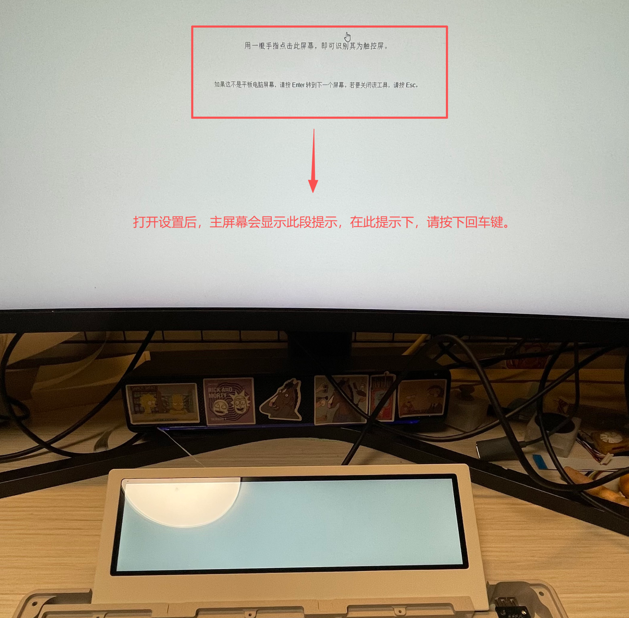 - 屏幕第一次插上键盘主体后,系统会自动安装驱动,大约3分钟左右,如果长时间没有反应,请拔掉屏幕重新插。点亮屏幕后请先跟着教程来做一些简单的设置。